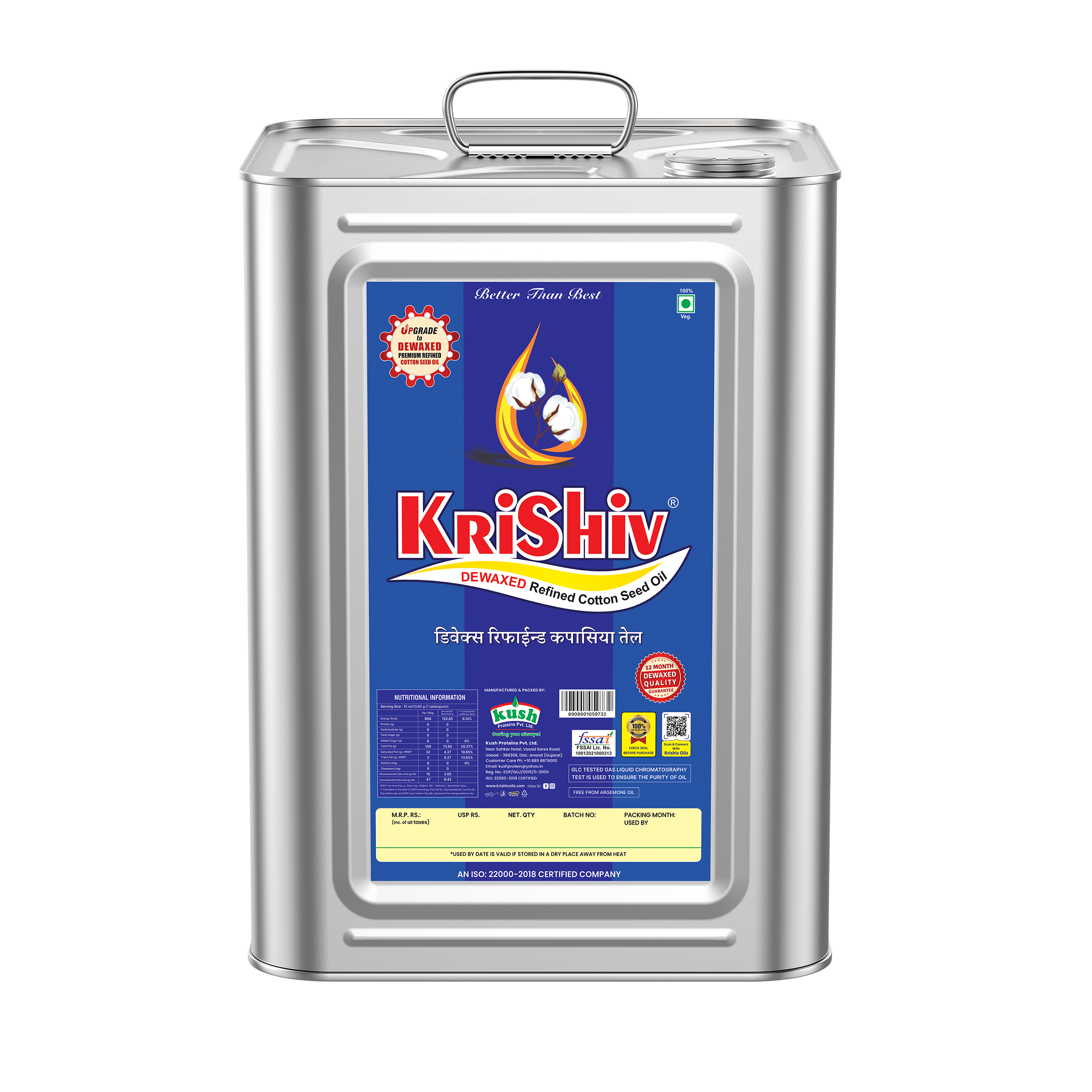 KRISHIV Cottonseed Oil is high in Vitamin E. Its light, nonoily consistency, and high smoke point make it ideal for stir-frying and frying. Unlike certain oils, it has a long shelf life and does not decompose at high temperatures. It is the most favored edible oil since it is refined and packaged at our cutting-edge refinery.